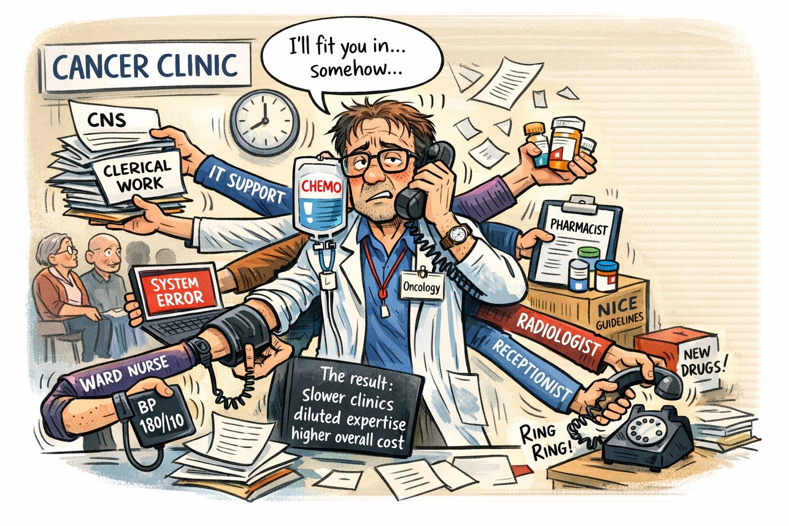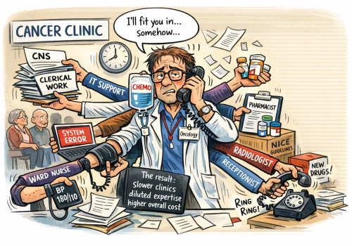 Since October 2023, I’ve been joint Head of Service for oncology at one of the largest acute trusts in England. It’s a trust full of committed, skilled, compassionate people doing everything they can for patients in increasingly impossible circumstances. It’s also a trust facing enormous financial pressures. For 2025-2026 our savings target was just under £100m, much of it coming from reducing corporate and support staff and limiting recruitment.